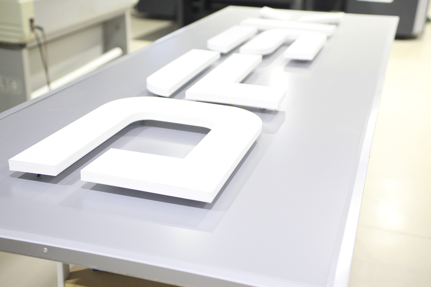 The illuminated sign is made with three-dimensional letters and logos carved on a 3 cm thick coplast.